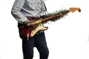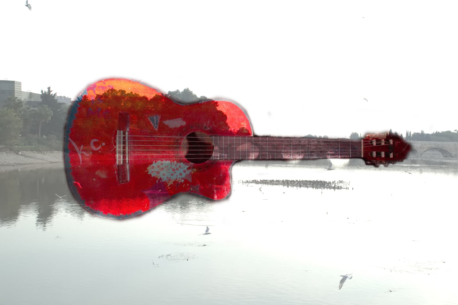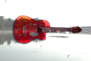 Serinin ilk iki karesinde (klasik ve elektro gitar kompozisyonları), dikkatimi çeken ilk unsur, enstrümanın fiziksel formunun adeta şehrin bir tuvaline dönüşmüş olmasıdır. Köprüler, nehirler, binalar ve palmiye ağaçları gitarın ahşap gövdesine işlenmiş durumda. Bana göre bu fotoğraflar, müziğin şehirden yalıtılmış, kapalı kapılar ardında üretilen bir ses yığını olmadığını; aksine kentin nefes alışverişinden, mimarisinden ve sokaklarının ritminden doğduğunu kanıtlıyor. Gitarın telleri titreştiğinde aslında duyduğumuz ses, o nehrin akışı veya o köprüden geçenlerin ayak sesleridir. Görseldeki saydamlık, şehir ve sanat arasındaki sınırları kaldırarak ikisini tek bir bedende eritmektedir.